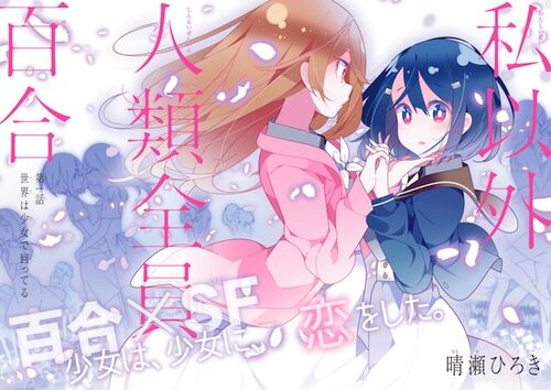 「私以外人類全員百合」は晴瀬ひろきによる漫画作品。 2018年12月よりComic Walker・ニコニコ静画などのWebコミックサイトで連載を開始した。 実力派が描く。百合✕SFストーリー! 「普通」を愛する潤野茉莉花は、ある朝、通学中に女生徒同士がキスをしている…